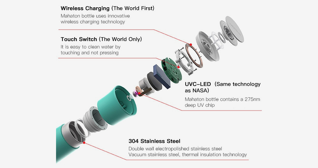 瓶蓋內(nèi)裝有紫外線LED殺菌裝置,照射進瓶中,反射到瓶口的金屬表面,殺死水中的任何微生物,并去除任何臭味。先進的275nm紫外線可以在90秒內(nèi)輕易殺死瓶子里的任何細菌,保證每次滅菌后水源都是純凈。水杯本身配備了獨特的無線充電底座,使水杯有效防水,也有助于你輕松地為Mahaton的紫外線裝置充電。